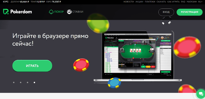 PokerDom – это самый большой русскоязычный покер-рум в интернете, где можно играть в карточные дисциплины или совершать ставки в местном онлайн-казино на российские рубли и на иностранную валюту. На официальном сайте или в скачиваемом приложении имеется колоссальный ассортимент видов покера, самых распространенных в России платежные инструментов, позволяющих пополнять депозит и обналичивать свои выигрыши без комиссий.